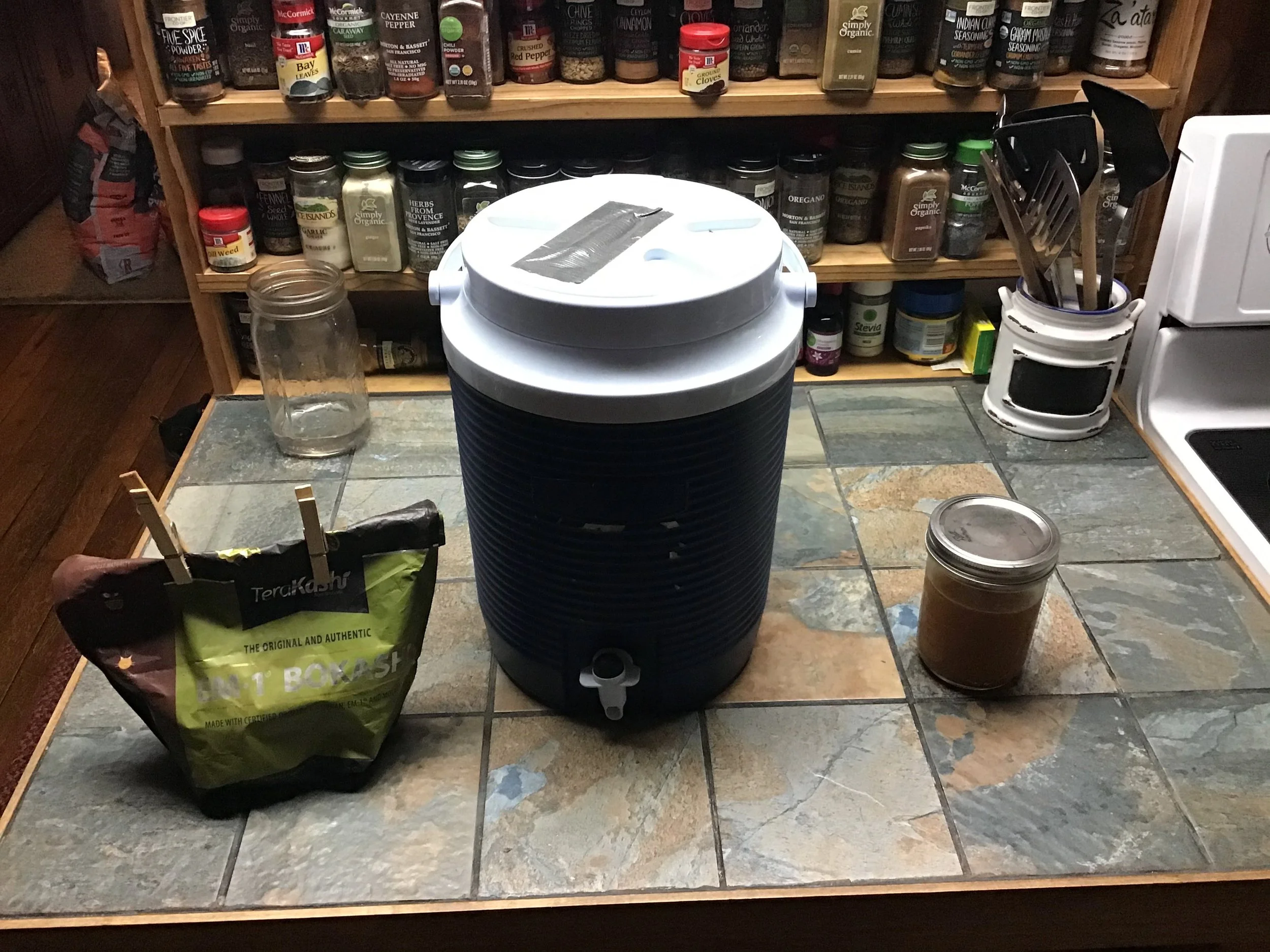 (From left): Bag of bokashi bran, homemade 3.5 gallon bokashi bucket, jar of bokashi “tea”