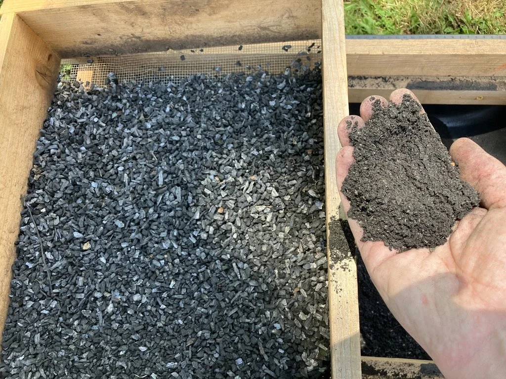 Simply crushing the biochar wasn’t the end of it however, that merely made some smaller pieces. For the purpose of consistency (and to appease my OCD) I then ran all of the biochar through two screens. The first at 1/4” and the second at 1/8”. Thankfully, I made a handy-dandy mobile sifter for sifting out worms from vermicompost which worked perfectly with the biochar as well! I’ll post the plans someday for the sifter, it sure ain’t anything fancy, but I’ve found it to be incredibly useful when dealing with smaller amounts of material.